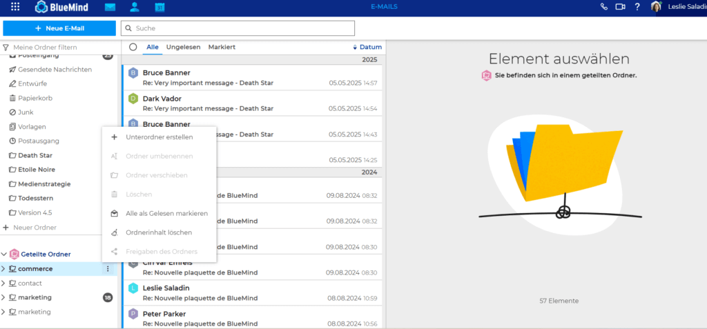 In den Versionen bis 5.4 haben wir BlueMind massiv mit Funktionen angereichert, die Power-User erwarten: Freigabe individueller Ordner, zeitversetztes Senden, Konversationsansicht, EML-Import und der Download aller Anhänge mit einem Klick.