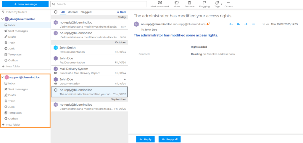 Shared mailboxes evolve into true Exchange-style shared mailboxes. BlueMind is the first and only alternative solution to support Exchange shared mailboxes in their full functional scope. These are real mailboxes with their own calendars, address books, categories, and filters, offering teams a structured shared workspace, whether accessed from Outlook or webmail.